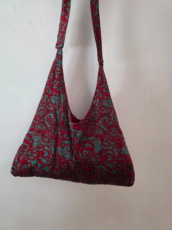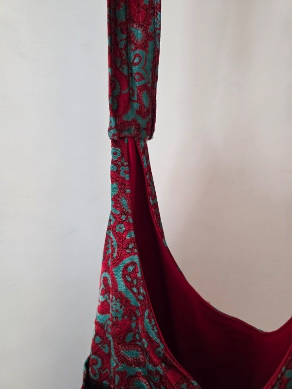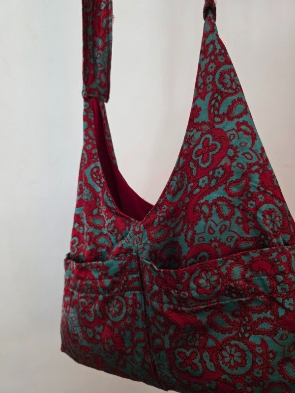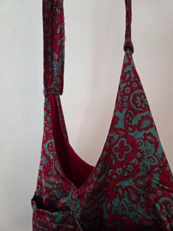 Tote hecha a mano reutilizada de un vestido/camison vintage; con bolsillos en la parte delantera y forro interno en color rojo.