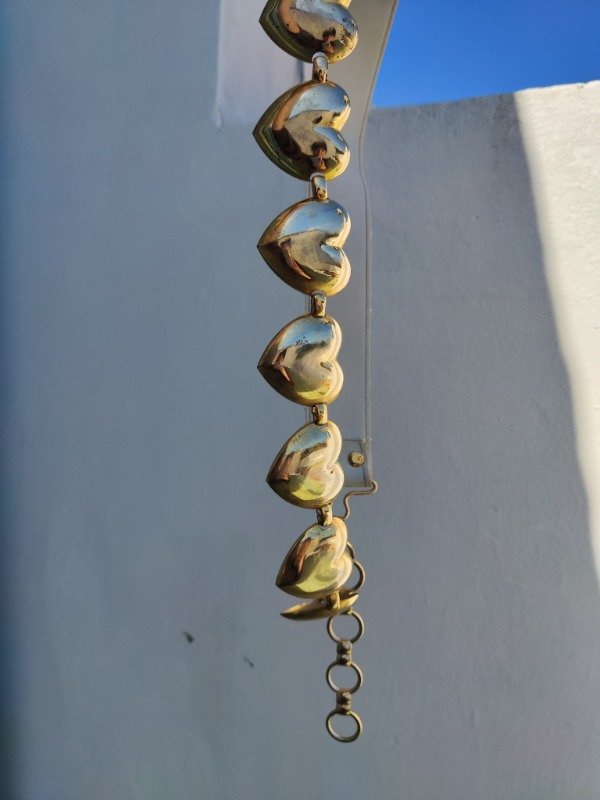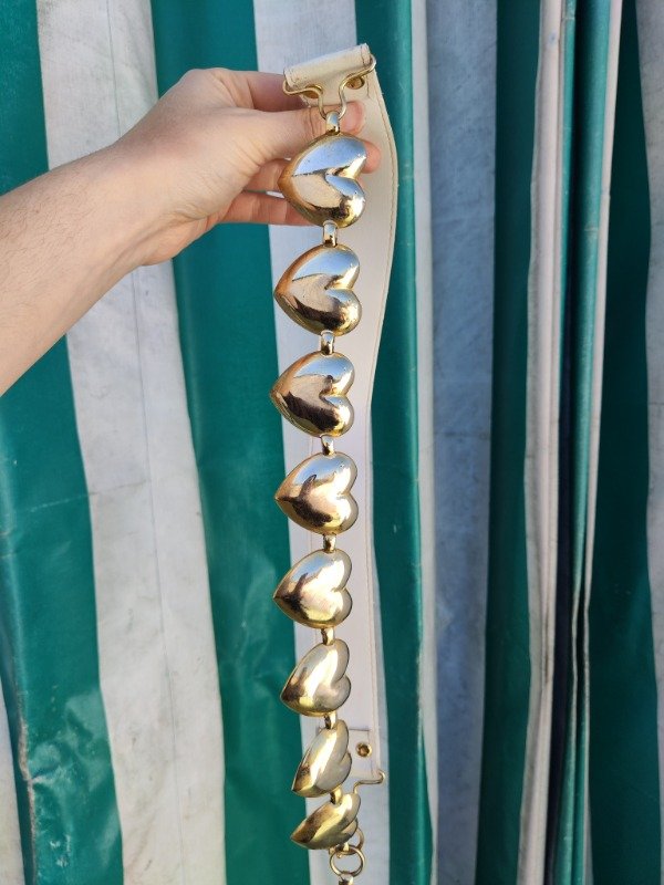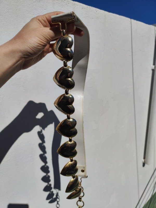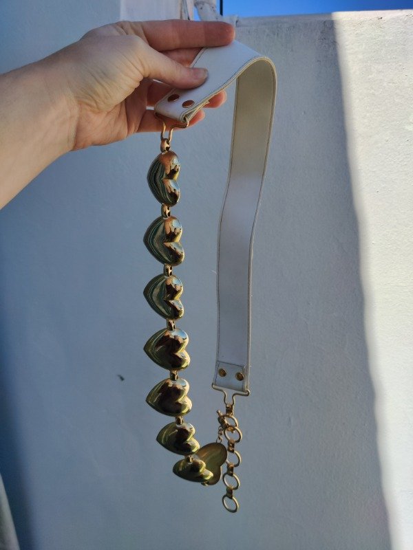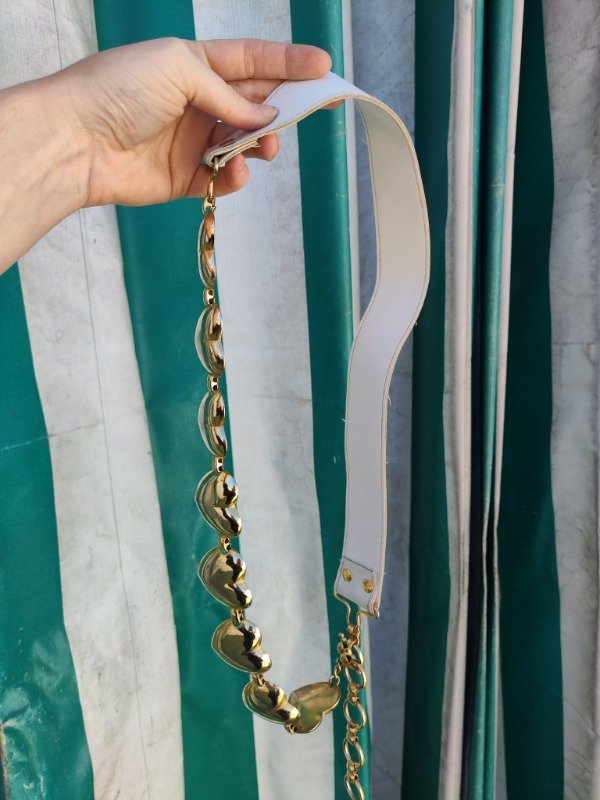 Hermoso cinturón super único y precioso de cuero genuino blanco combinado con dijes de corazón dorados. Una hermosura :) tiene algunos detalles en los corazones pero son mínimos.