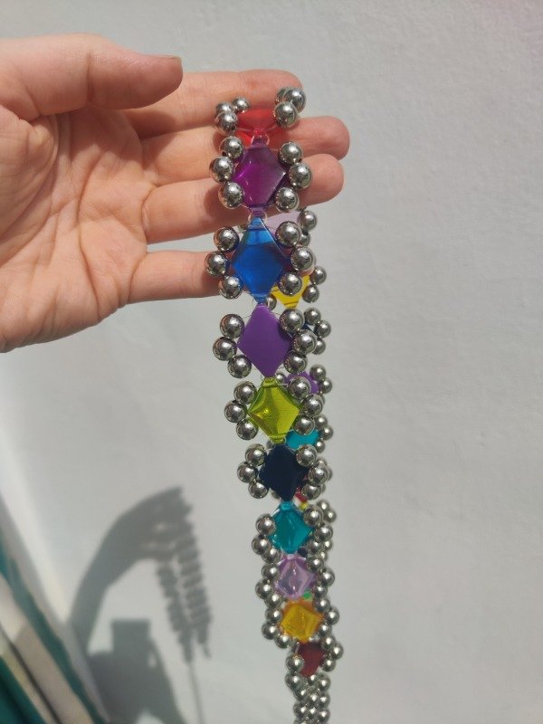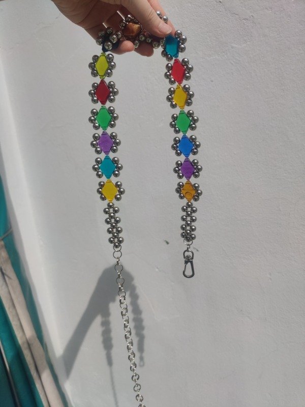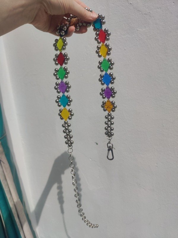 Cinturón Hecho a mano único, con cuentas plateadas y rombos de plástico de colores. Cuenta con un mosquetón grande y cadena para ajustar a medida. Tiene 85cm de largo.