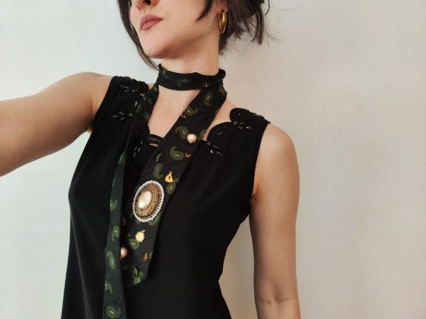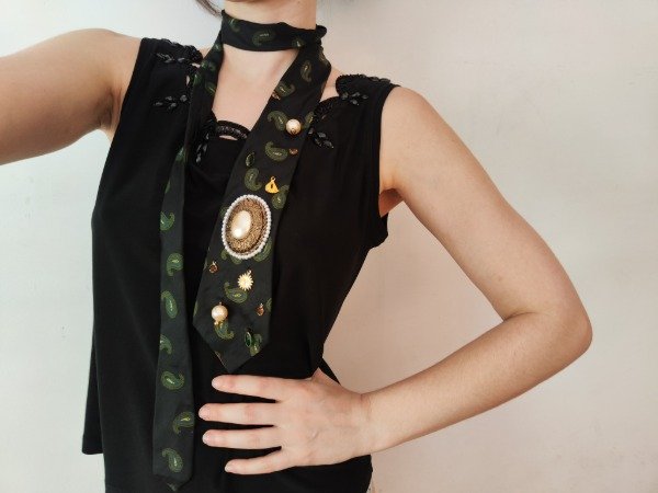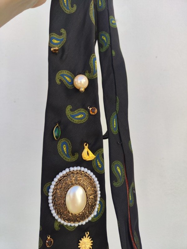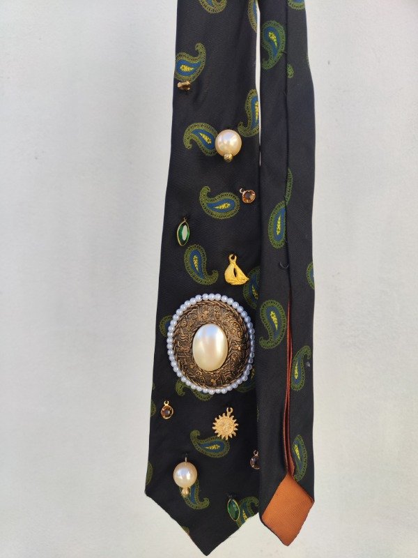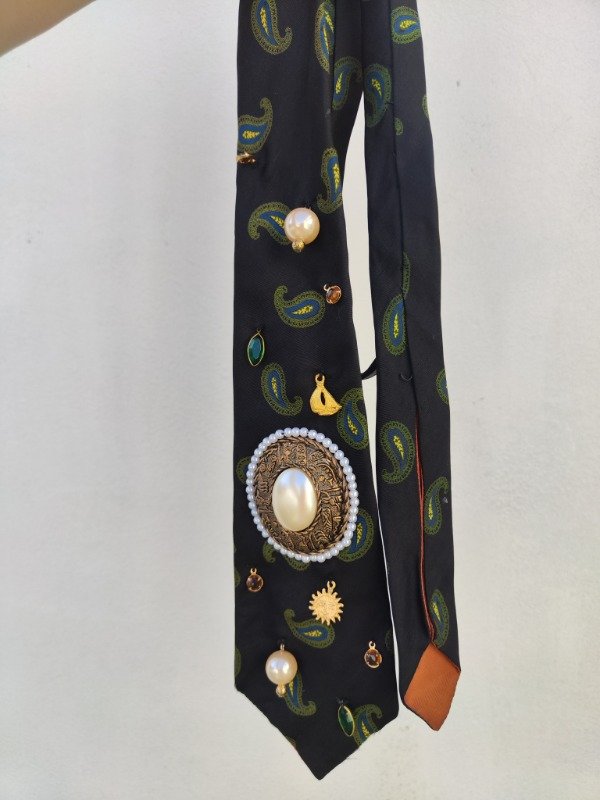 Corbata divina en color azul oscuro con diseño de arabescos en color verde y azul. Con bordado a mano de dijes dorados, perlas y acrílicos. Cuenta con un centro de perlas y diseño dorado. 🦋