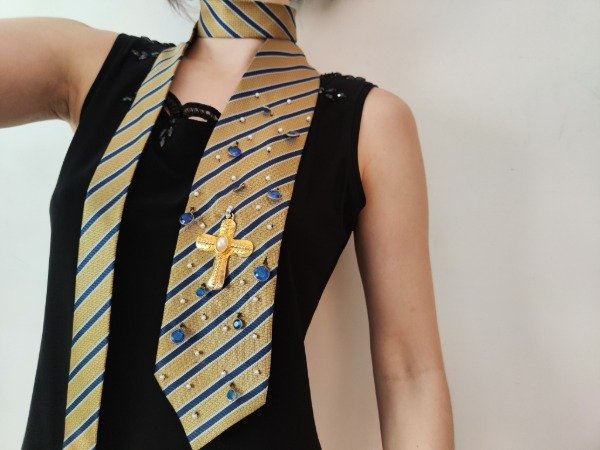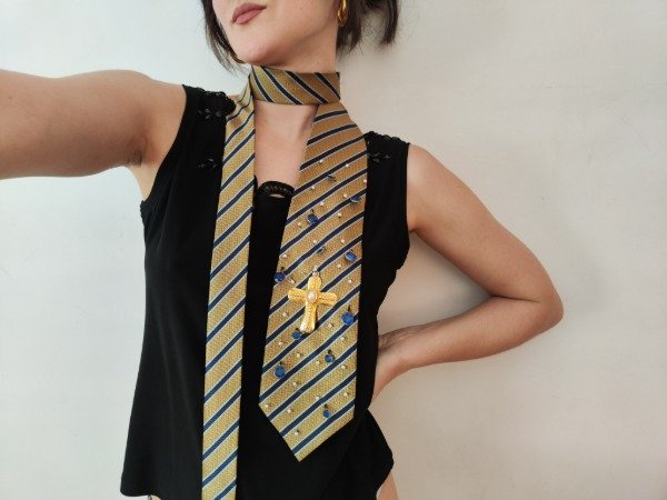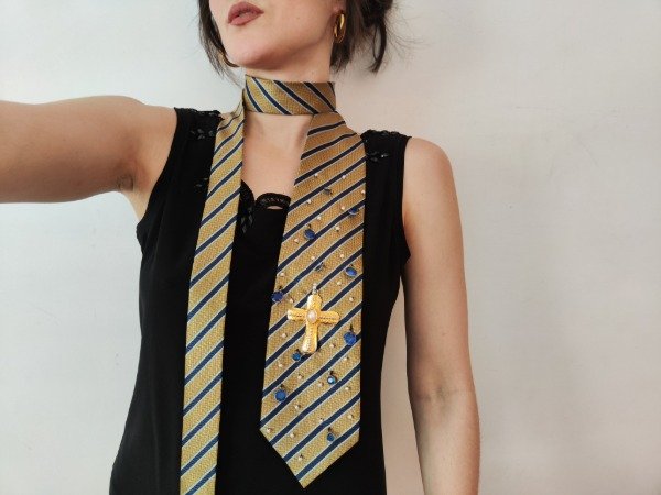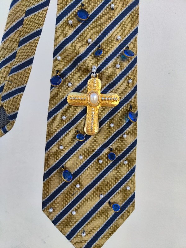 Hermosa corbata de Pierre Cardin en color dorado con rayas azules y blancas. Cuenta con un bordado hecho a mano de perlas y dijes azules. En el centro tiene una cruz grande!