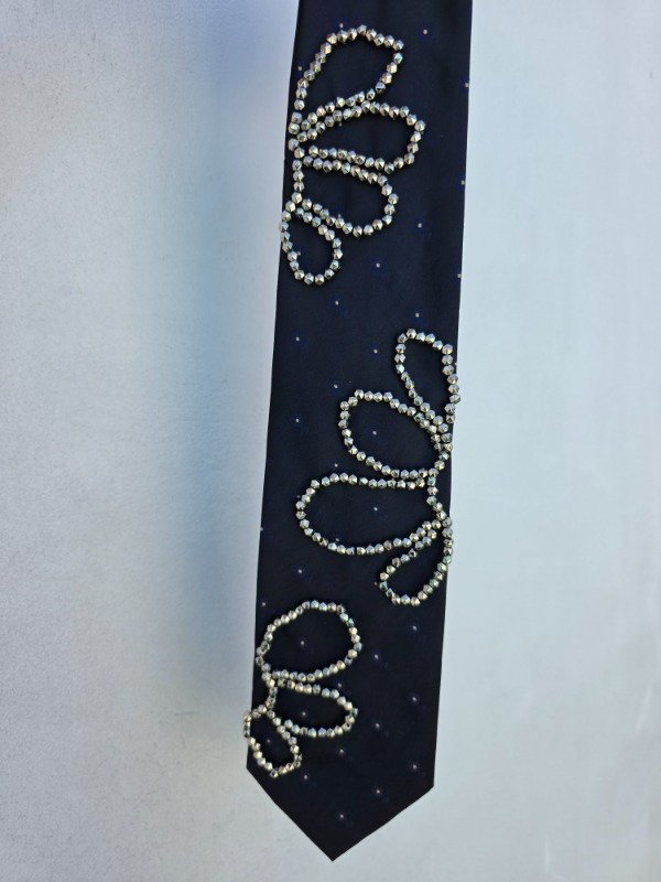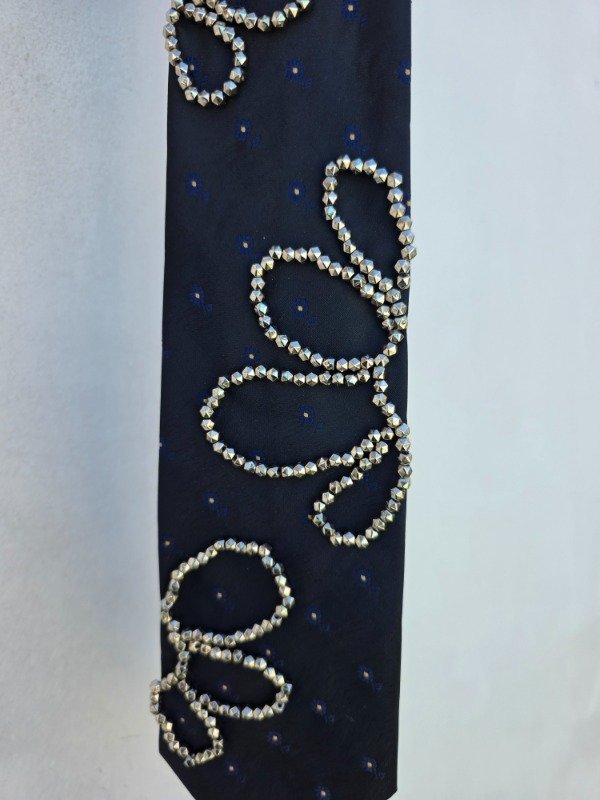 Corbata vintage en color azul oscuro con margaritas pequeñas en color dorado y blanco. Tiene hecho a mano un diseño de flores cortadas con cuentas plateadas chicas. En perfecto estado, como nueva.