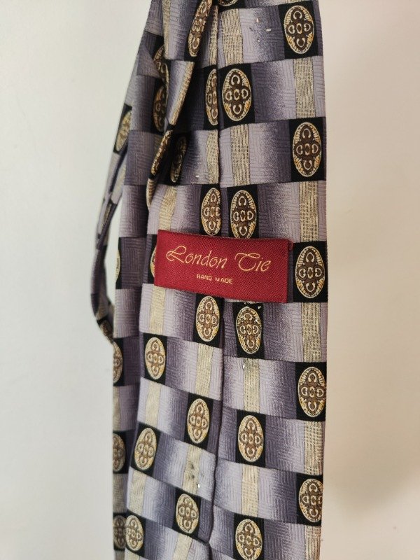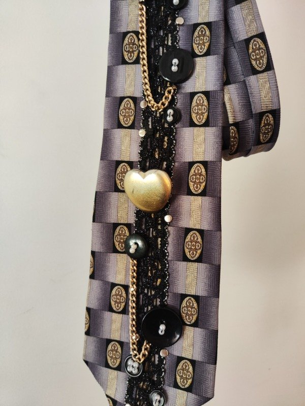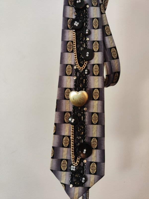 Hermosa corbata vintage intervenida a mano, unica, de la marca London Cie, hecho a mano; con botones cosidos, cadenas doradas, tachas y encaje de color negro.