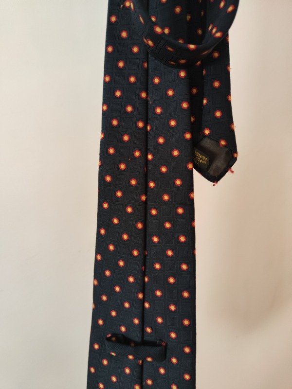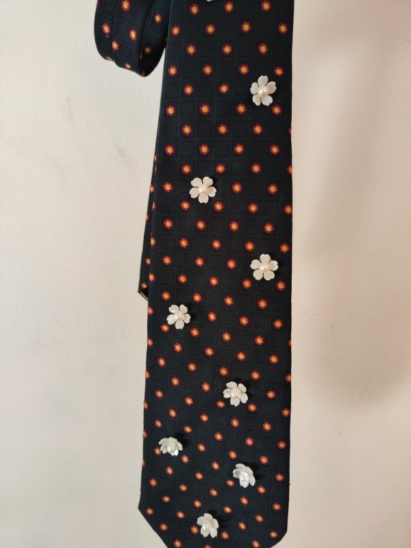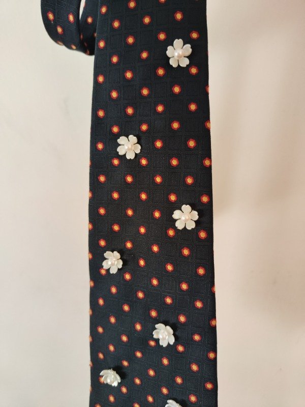 Hermosa corbata vintage intervenida a mano, unica, con florcitas blancas cosidas y centro de perlitas.