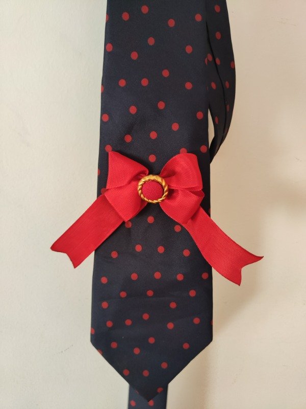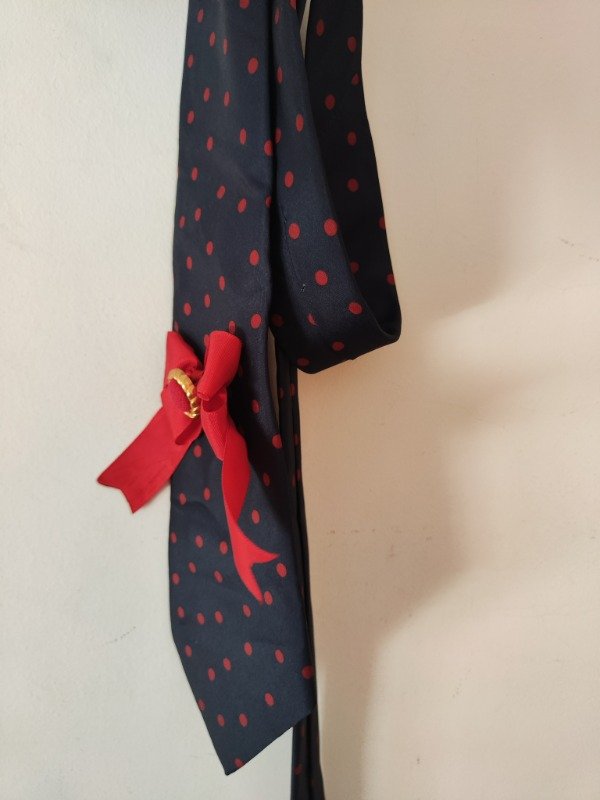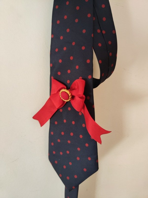 Hermosa corbata vintage intervenida a mano, unica, con diseño de moño en el centro en color rojo con boton vintage en el centro.