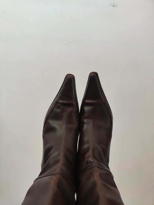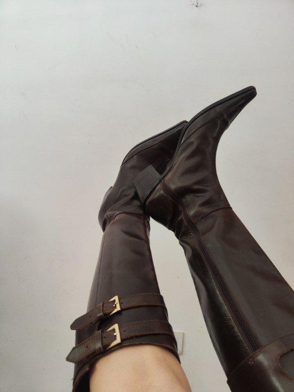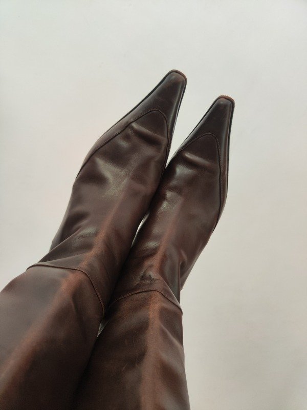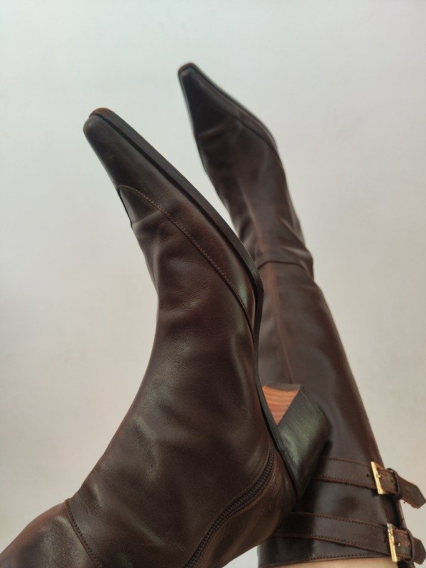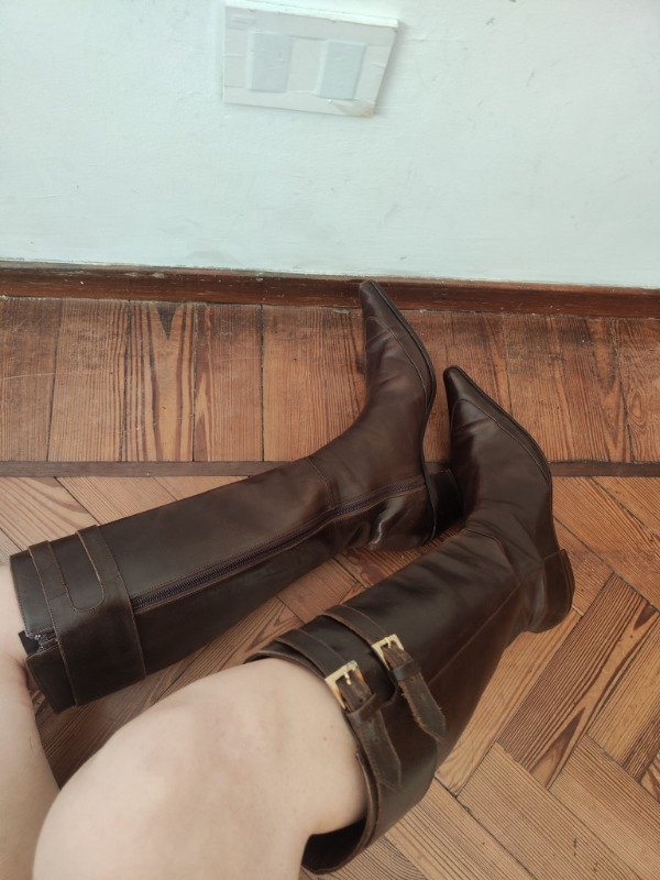 Botas de caña alta de cuero genuino en color marrón oscuro; cuenta con un un taco medio con punta redonda. Tiene un cierre al costado y herrajes dorados para cerrar. Divinas! En muy buen estado