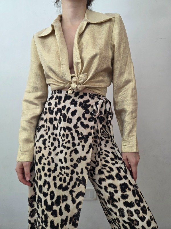 Camisa abierta en color dorado de lurex, super brillos. Tiene pinzas en el busto! Divina, ideal para ponerse algo abajo o mismo cerrarla con un nudito.