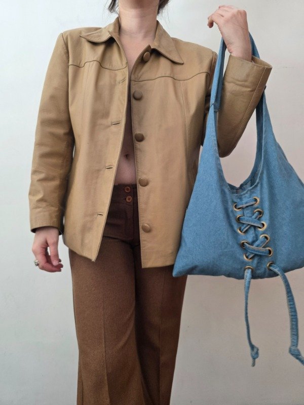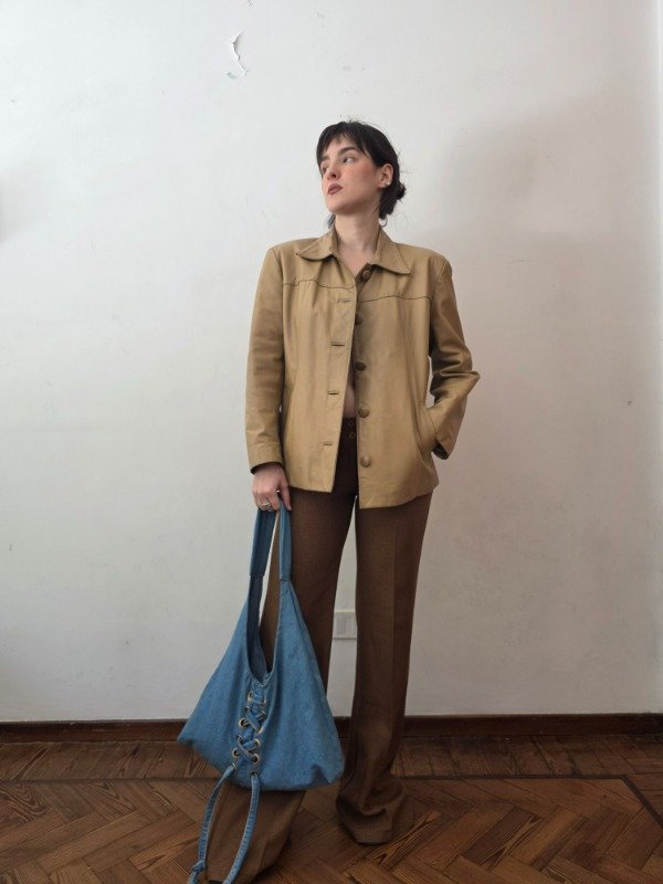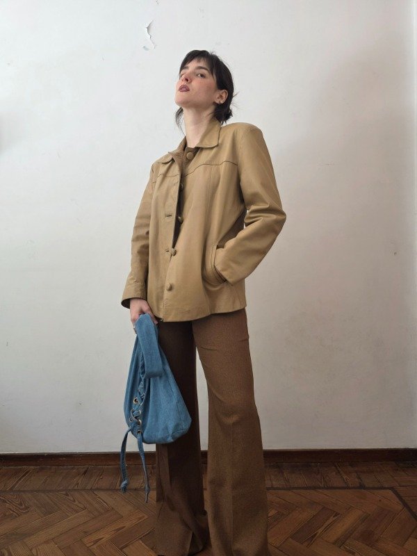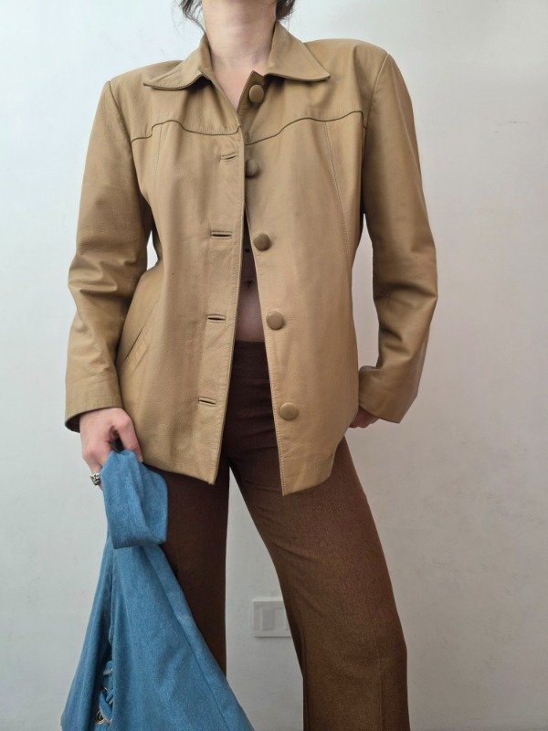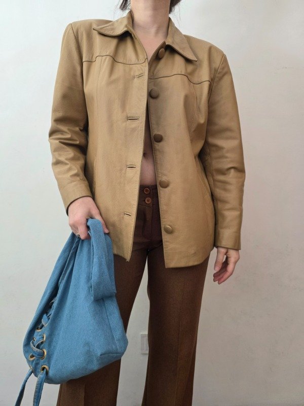 Campera/saco de cuero genuino en color camel, con botones a tono forrados y bolsillos a los costados. Cuenta con forro en color beige. Es una hermosa campera para usarla y que te dure muchos años/décadas. Tiene algunos detalles típicos del uso pero se reacondiciono y limpió para que quede impecable.
