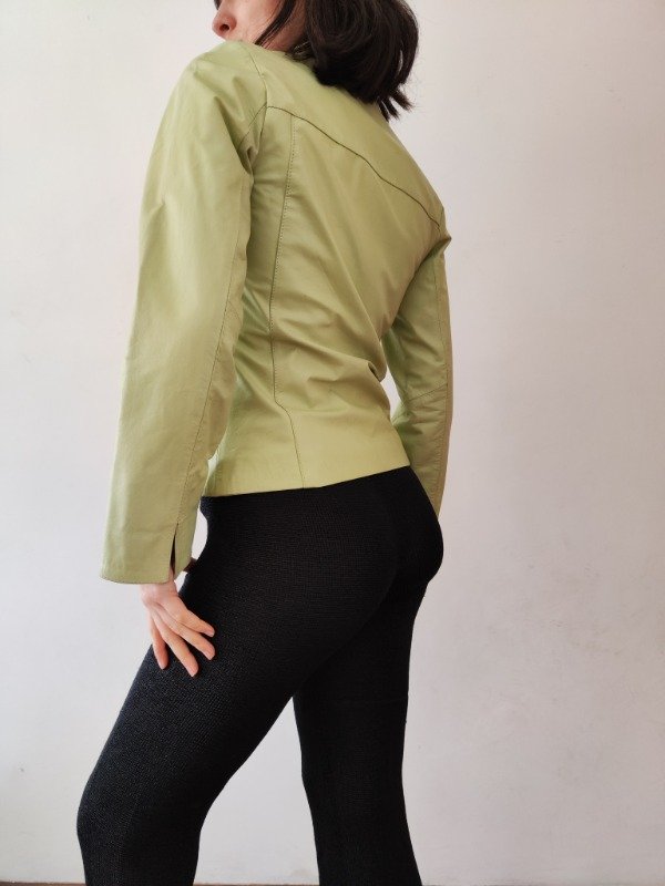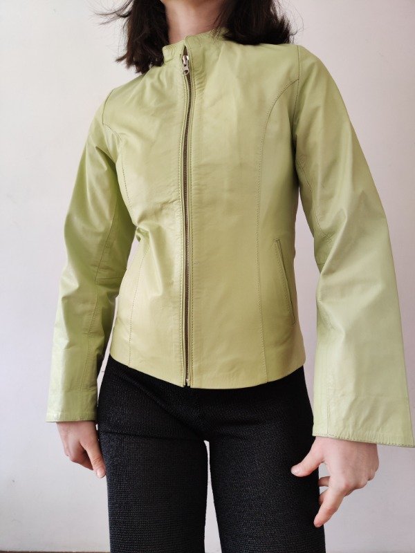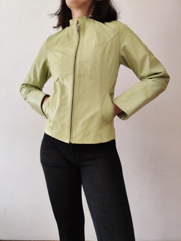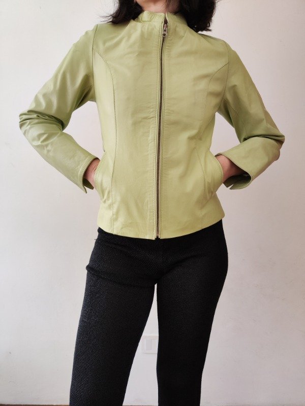 Hermosa campera de cuero genuino marca American Leathers en color verde, con cierre en el centro y bolsillos a los costados. Tiene forro. Está enteramente forrada! Está impecable.