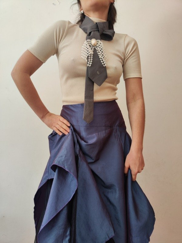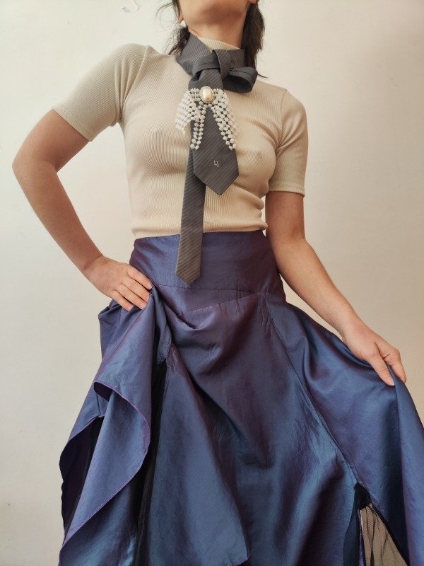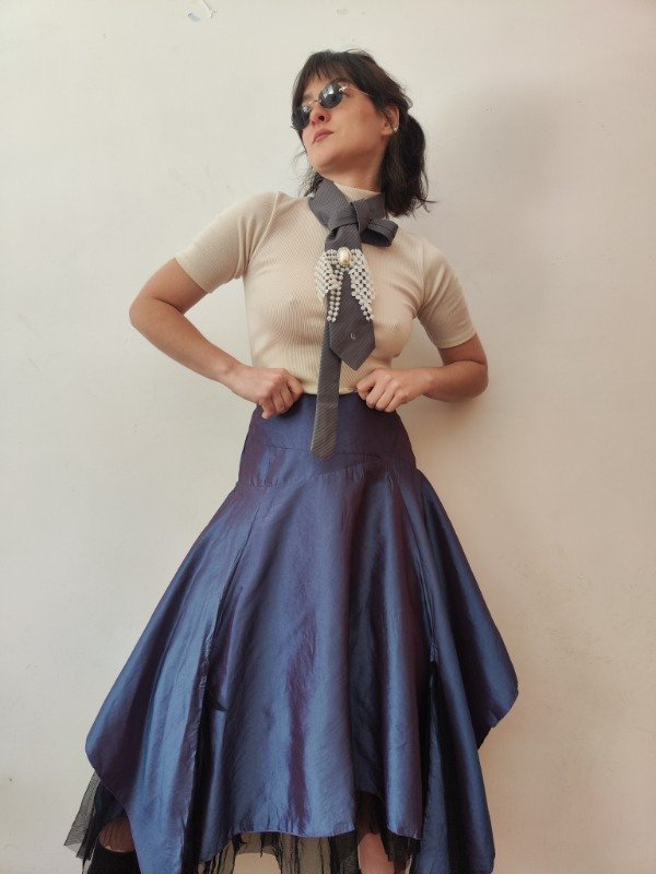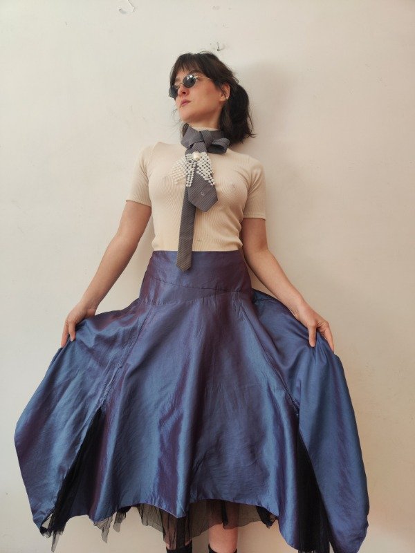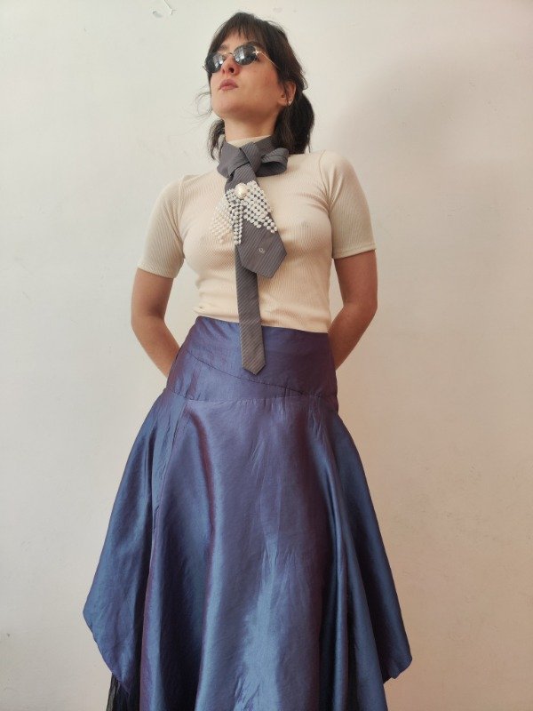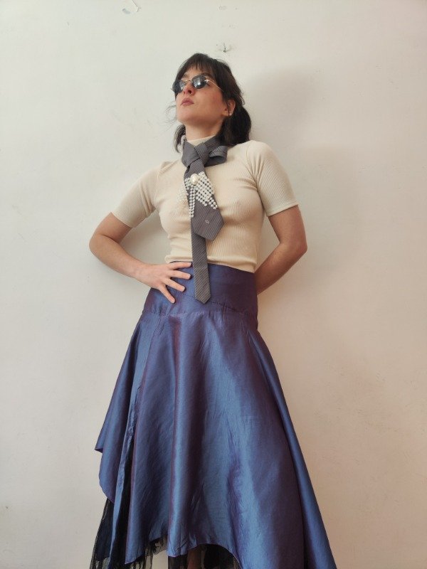 Maxi falda nueva de tafeta con tul, con diseño en picos irregular; cuenta con forro y doble tela en la cintura. La tela es tipo tornasol, muy linda. Tiene cierre a un costado. Hermosa para usarla en fiestas, eventos, pero también de forma más casual con zapatillas/top o camisa.