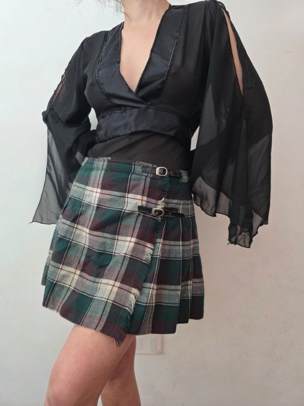 • Falda tartan en color verde inglés, blanco y bordo, con tablas a la cadera y cerrajes a la cintura. Ideal para otoño/invierno!