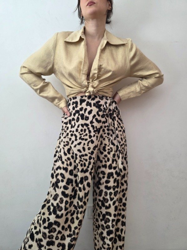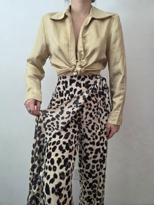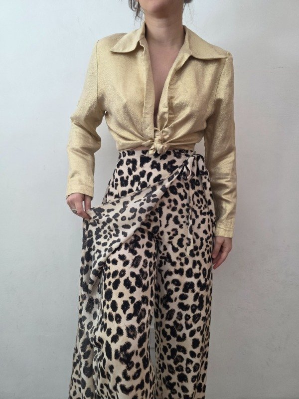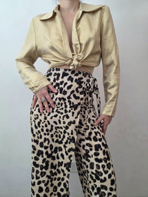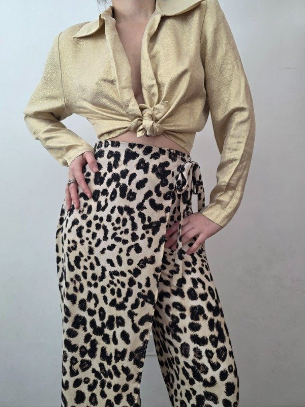 Pantalon de animal print second hand, en color beige con diseño marron y negro. Tiene una mini falda con lazo a la cintura, ofreciendo un diseño diferente. Es una tela suavecita, para media estación. Marca Zara