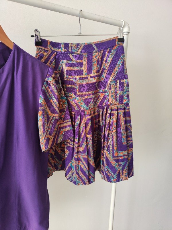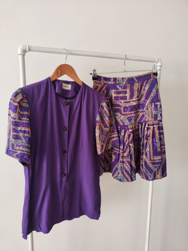 Conjunto divino en color violeta de la marca Kleider, creacion Peruana, super fresco y comodo. La falda tiene tablas en la zona de la cadera, con diseño de guardas de colores. La camisa tiene botones negros y dorados, con las mangas de la misma tela de falda :) Una belleza! La camisa tiene una manchita de lavandina!