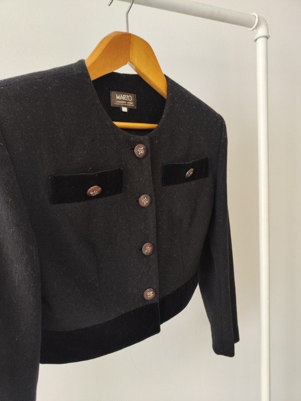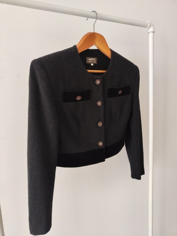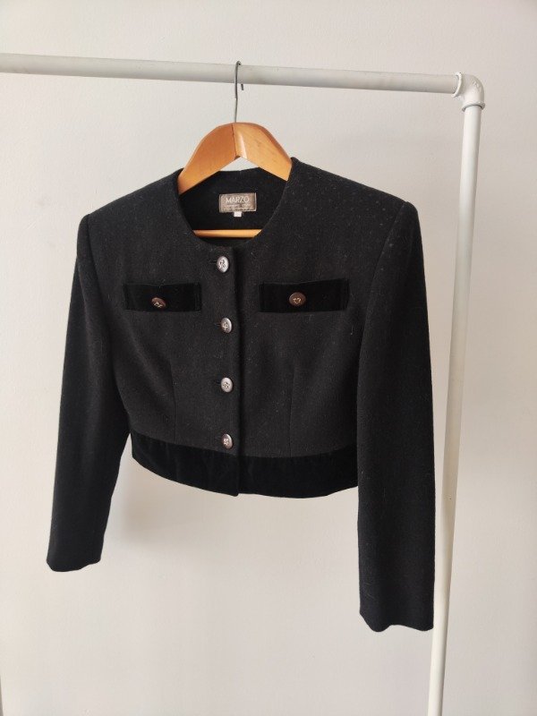 Saco corto divino en color negro de lana y terciopelo, con bolsillo pequeño en la zona del pecho. Los botones son divinos con una especie de escudo. Está enteramente forrado. tiene lavado en seco hecho en tintorería.