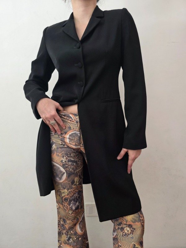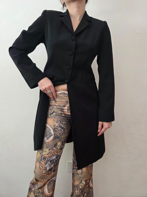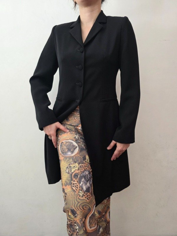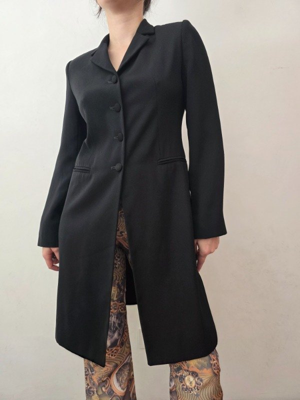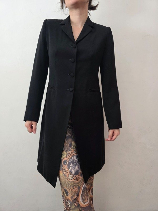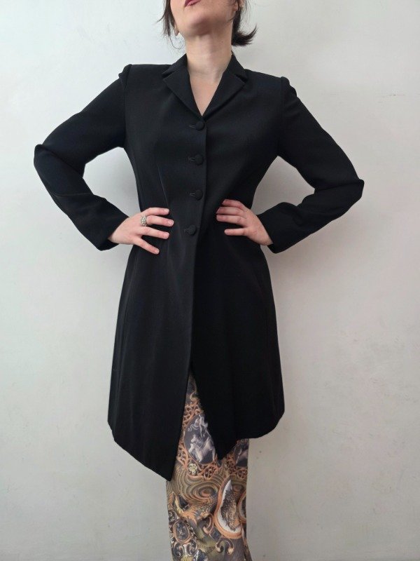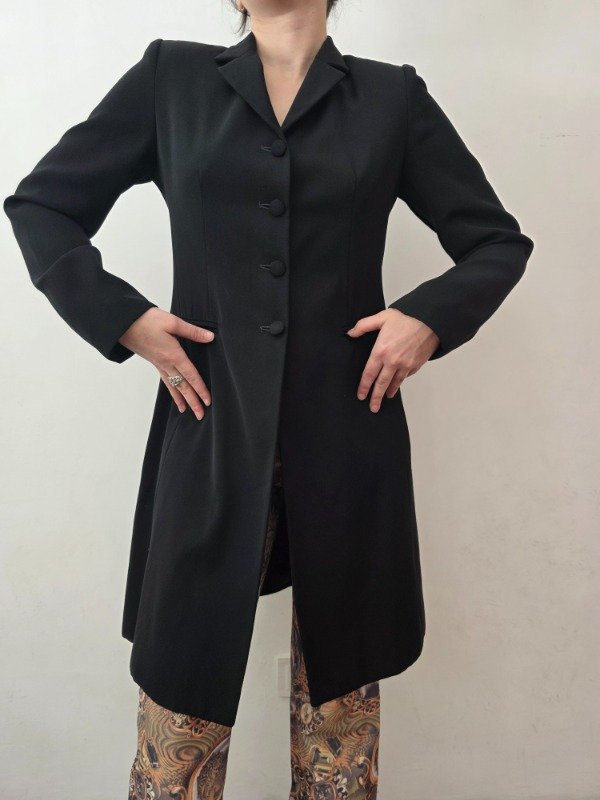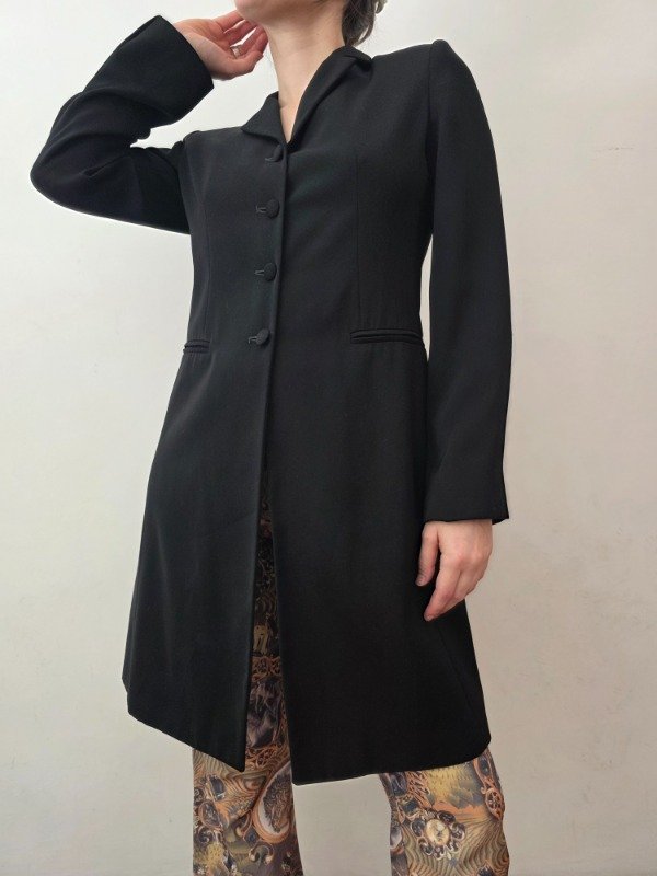Bellísima tapado largo para media estación en color negro con botones forrados, bolsillos a los costados, forro interno y hombreras delicadas. Hermoso y mega elegante.