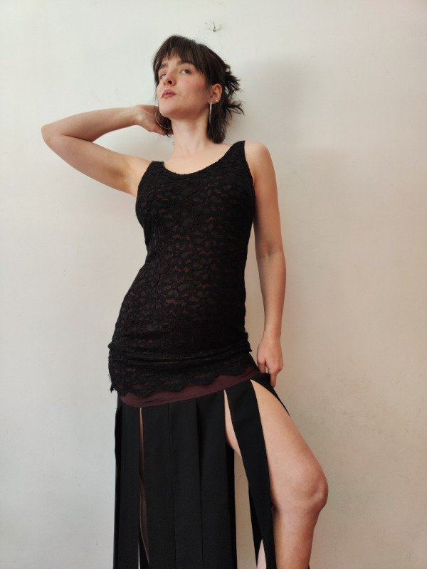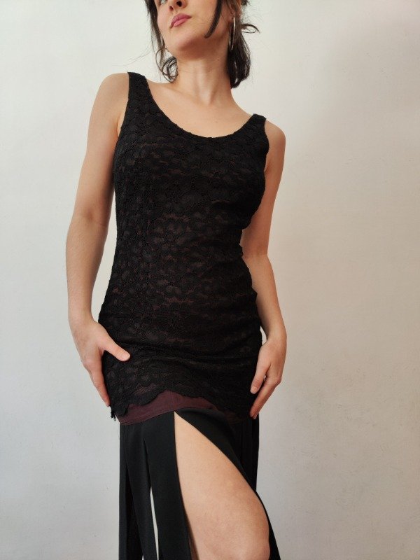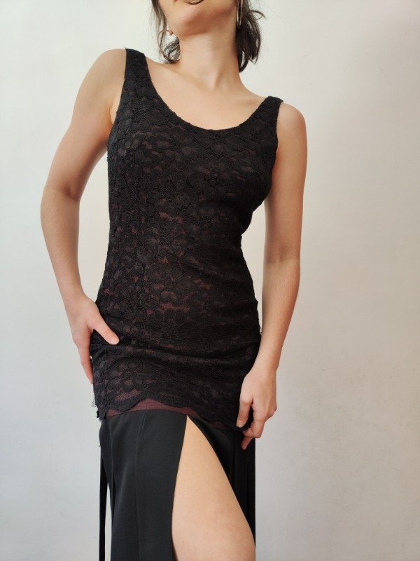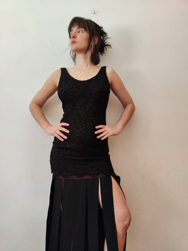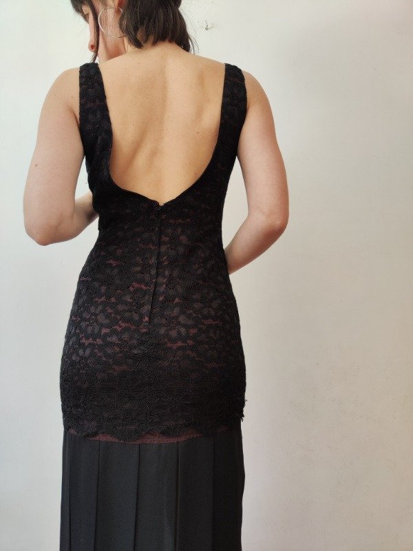 Vestido de encaje floreado con espalda súper descubierto, con diseño de falda en crepe en color negro con diseño de tiras. Entallado, con cierre atrás.