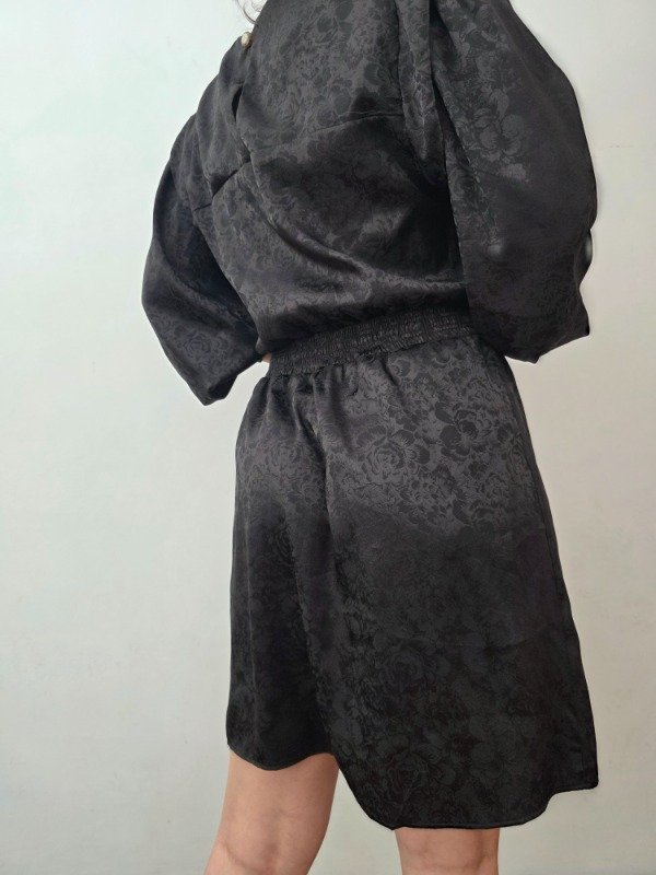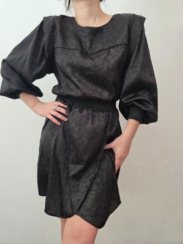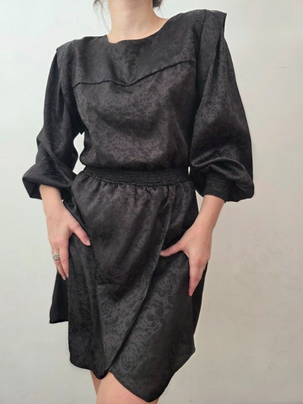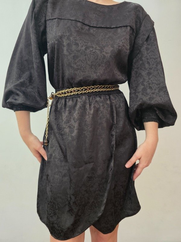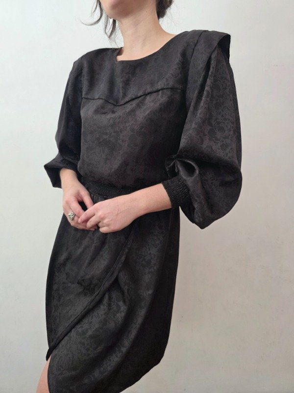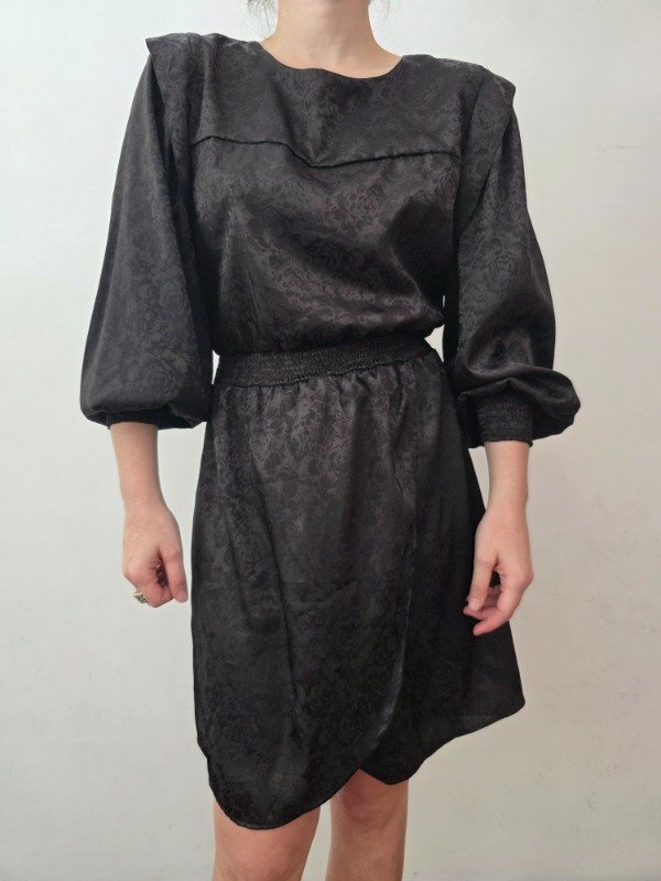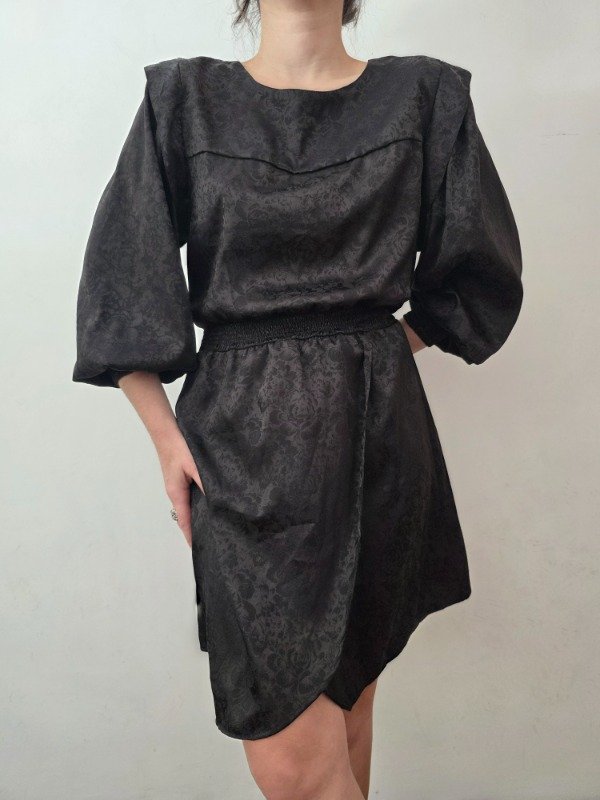 Bellísima vestido negro labrado con diseño de flores espectacular. Cuenta con manguitas princesa y puños elastizados. La falda esta abierta a un lado, tipo pareo. Atras tiene un botón para poder ponérselo. Bellísima tela y diseño.